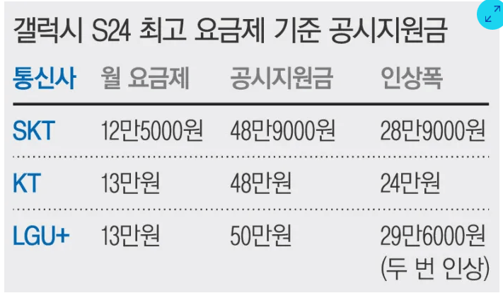 3.KT: 이날 갤럭시S24 시리즈의 공시지원금을 5세대 이동통신(5G) 요금제 기준 5만∼24만 원에서 5만5천∼48만 원으로 상향 조정했다.