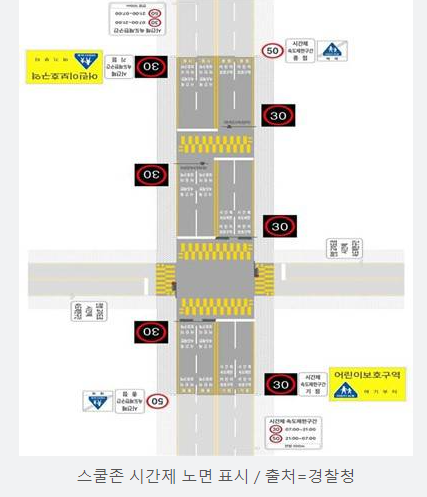 하지만 스쿨존은 등하교 시간대(오전 7∼9시·낮 12시∼오후 4시)에 시속 30㎞로 제한속도를 하향할 전망입니다. 경찰은 이 같은 스쿨존 시간제 속도제한을 운전자들이 명확하게 인지할 수 있도록 노면 표시를 의무화할 계획입니다.