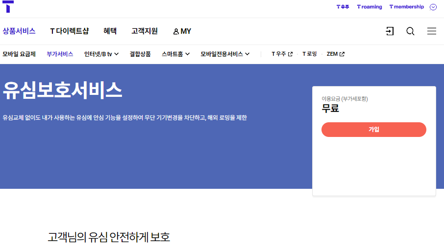 - 로그인 후 '부가서비스' → '유심보호 서비스' 검색